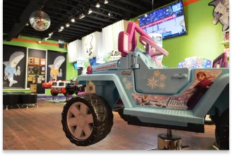 Why sit in a just a regular styling chair? At Sharkey's kids can sit in their choice of a fun car! Including a Firetruck, Troll Jeep, Spiderman, Blue BMW, and more! (cars vary per location)